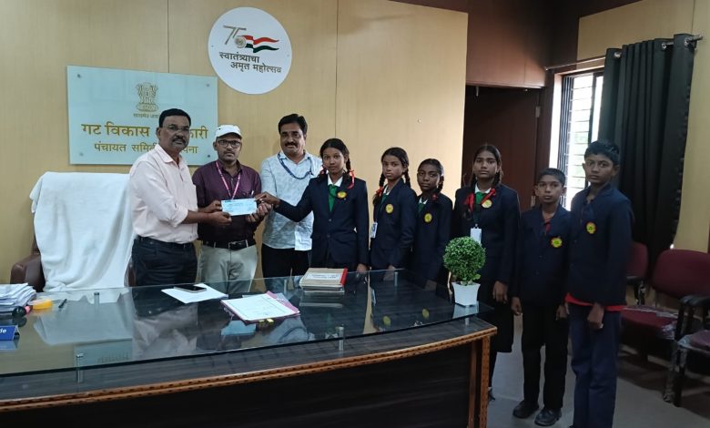 त्या दृष्टीने त्यांनी सदरील रक्कम जमा करून बँक खात्यात जमा करून धनादेशाद्वारे ही रक्कम पंचायत समिती कोरपणाचे गटशिक्षणाधिकारी श्री कल्याण जोगदंड यांच्या वतीने गटविकास अधिकारी श्री श्रीकांत बोबडे यांना आज सुपूर्द केली. यावेळी गटशिक्षणाधिकारी व गटविकास अधिकारी यांनी विद्यार्थ्यांचे कौतुक केले. प्रतिनिधी स्वरूपामध्ये शालेय मंत्रिमंडळाचे विद्यार्थी वास्तव्या शेडमाके, सलोनी झाडे, आराध्या पाचभाई, अथर्व धोटे, सिद्धेश्वरी कोलांडे, अन्वय कुचनकर उपस्थित होते. शिक्षक प्रतिनिधी म्हणून श्री काकासाहेब नागरे उपस्थित होते.