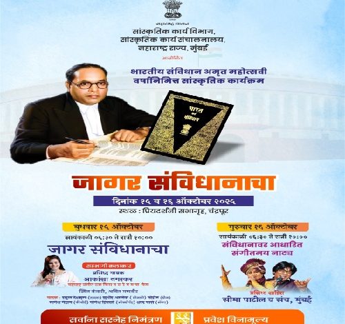 सांस्कृतिक कार्य विभाग, सांस्कृतिक कार्य संचालनालय, महाराष्ट्र शासन यांच्या वतीने भारतीय संविधान अमृत महोत्सवी वर्षानिमित्त 15 व 16 ऑक्टोबर रोजी सायं. 6 वाजता प्रियदर्शनी सभागृह, चंद्रपूर येथे सांस्कृतिक कार्यक्रमांचे आयोजन करण्यात आले आहे.