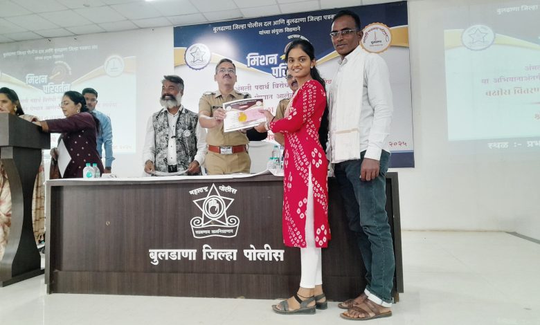 बुलढाणा जिल्हा पोलीस दल आणि बुलढाणा जिल्हा पत्रकार संघ यांच्या संयुक्त विद्यमाने “मिशन परिवर्तन – अमली पदार्थ विरोधी अभियान” या उपक्रमांतर्गत आयोजित जिल्हास्तरीय निबंध स्पर्धेमध्ये समर्थ कृषी महाविद्यालय, देऊळगाव राजा येथील विद्यार्थिनी कोमल इंगळे हिने शालेय गटामध्ये प्रथम क्रमांक मिळवून महाविद्यालयाचे नाव उज्ज्वल केले आहे.