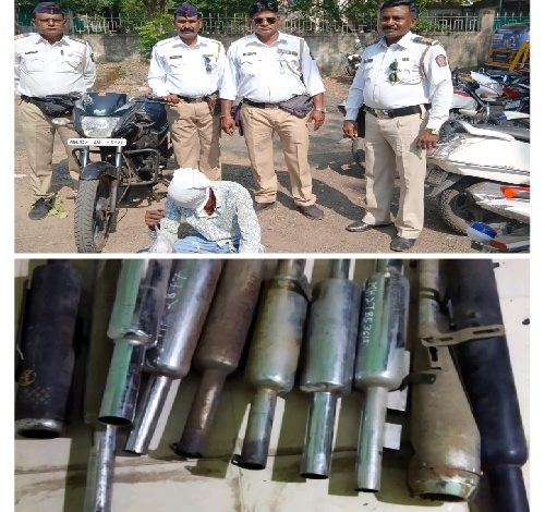 तसेच बुलेट गाडीचे मोठ्या आवाजचे बनावट सायलेंसर जे मोठा आवाज करतात फटाके फोडतात इतर नागरिकांना त्रास होईल असा मोठा कर्कश आवाज करून वाहन चालवीतात असे 12 बुलेट सायलेंसर ही वाहतूक पोलिसांनी आज मोटार वाहन कायदा कलम 194 अन्वये कार्यवाही करून जप्त केलेले आहेत. तरी बुलेट चालक यांना आवाहान आहे कि मोठ्या आवाजाचे डुप्लिकेट सायलेंसर लावून वाहन चालवू नये अन्यथा सायलेंसर हे जप्त करण्यात येतील.