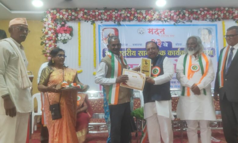 ब्रम्हपुरी :- तालुक्यातील अ-हेरनवरगांव येथील रहिवासी कवी, सामाजिक कर्तव्याची बांधिलकी जोपासणारे, सामाजिक, शैक्षणिक, वृक्ष लागवड या कार्यात तळमळणारे आणि जनतेचे आरोग्य सुदृढ, निरोगी राहावे यासाठी परिसर झाड लोट करून स्वच्छ ठेवणारे अमरदीप लोखंडे यांच्या कार्याची दखल घेत मदत सामाजिक संस्था, नागपूर यांनी 16 नोव्हेंबर 2025 रोजी श्री गुरुदेव सेवाश्रम, नागपूर येथे पार पडलेल्या राज्यस्तरीय सामाजिक कार्यकर्ता संमेलन पुरस्कार सोहळ्यात संत गाडगेबाबा स्वच्छतादूत पुरस्कार, प्रमाणपत्र व भारताचे संविधान संस्थेचे सचिव दिनेशबाबू वाघमारे व पदाधिकारी यांनी देऊन त्यांचा गौरव केला.