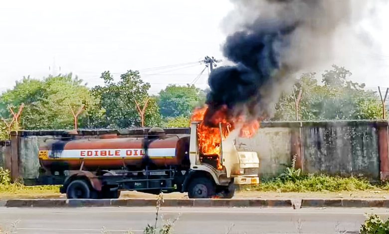 अत्यंत ज्वलनशील असणारा सोयाबीन तेल वाहून नेणाऱ्या टँकरने अचानक पेट घेतला, मात्र अग्निशामक दलाने वेळीच घटनास्थळी धाव घेत आगीवर नियंत्रण आणून आग विझवल्याने मोठा अनर्थ टळला.