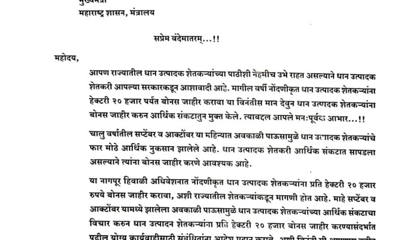 मुख्यमंत्री देवेंद्रजी फडणवीस यांनी राज्यातील धान उत्पादक शेतकऱ्यांच्या पाठीशी नेहमीच खंबीरपणे उभे राहत असल्याने शेतकरी बांधव आपल्या सरकारकडून आशावादी आहे. मागील वर्षी नोंदणीकृत धान उत्पादक शेतकऱ्यांना प्रतिहेक्टरी २० हजार रूपये धान बोनस देण्याच्या माझ्या विनंतीस मान देत आपण धान उत्पादक शेतकऱ्यांसाठी तात्काळ बोनस जाहीर करून त्यांच्या आर्थिक संकटातून मोठी मुक्तता केली. या संवेदनशील निर्णयाबद्दल आपले मनःपूर्वक आभार, असे आ. मुनगंटीवार यांनी पत्रात नमूद केले आहे.