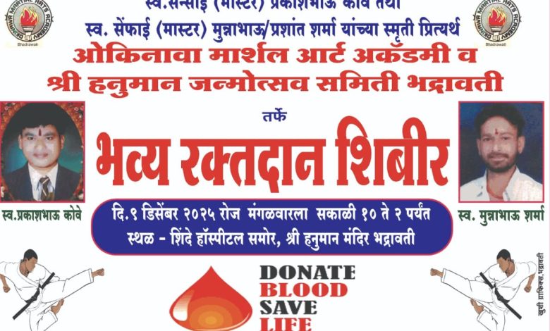 दरवर्षी प्रमाणे या वर्षी सुद्धा शहरातील आंतरराष्ट्रीय ख्यातीचे कराटे पटू सेंसाई मास्टर स्वर्गीय प्रकाश कोवे तथा सेमफाई मास्टर मुन्ना शर्मा यांच्या स्मुर्ती पित्यर्थ ओकीनावा मार्शल आर्ट कराटे डो सेंटर भद्रावती व श्री हनुमान जन्मोस्तव समिती भद्रावती तर्फे दिनांक ९ डिसे. रोज मंगळवार ला सकाळी १० ते ०२ वाजे पर्यंत शिंदे हॉस्पिटल समोर हनुमान मंदिर परिसर मेन रोड भद्रावती येथे भव्य रक्तदान शिबिराचे आयोजन करण्यात आले आहे या विविध कार्यक्रमाला पंधरा ते सोळा वर्ष होत आहे.