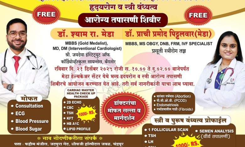 चंद्रपूर :_ जनसेवा हीच ईश्वर सेवा याला लक्षात ठेवून डॉ. श्याम मेडा तसेच डॉ. प्राची मेडा, यांच्या संयुक्त सहयोगाने दि. २१ डिसेंबर २५ ला रविवारी सकाळी १० ते दुपारी २ वाजेपर्यंत आरोग्य तपासणी शिबिर ठेवण्यात आले आहे. या शिबिरामध्ये हृदययाशी संबंधित तपासणी व स्त्रीरोग व वंध्यत्व यांची तपासणी करून योजना अधीन त्यांच्या काही सुटमध्ये त्यांचे समाधान करण्यात येणार आहे.
