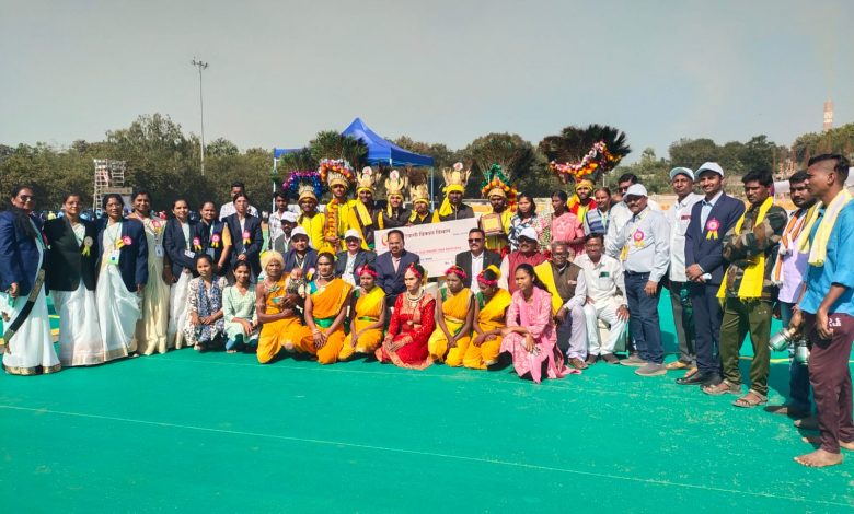 यामध्ये या कार्यक्रमाचे उदघाट्न आयुषी सिहं मॅडम उपायुक्त नागपूर आदिवासी विकास विभाग यांचे हस्ते पार पडले, यावेळी विकासजी राचलवार जिल्हा प्रकल्प अधिकारी आदिवासी विकास विभाग व आदिवासी समाजातील सामाजिक पदाधिकारी, व इतर 9 प्रकल्पाचे अधिकारी, कर्मचारी, व विद्यार्थी चंद्रपूर शहर व ग्रामीण मधून उपस्थित होते. त्यावेळी भगवान बिरसा कला संगम 15 वी जयंती निमित्य राज्यस्तरीय स्पर्धेत द्वितीय पारितोषिक रोख 2 लक्ष पटकविणाऱ्या चनई बु. ता. कोरपना येथिल पारंपरिक ढेमसा मंडळाला राज्यस्तरीय भगवान बिरसा कला संगम यामध्ये द्वितीय पारितोषिक पटकविल्याबद्दल चंद्रपूर जिल्हा आदिवासी विभागाच्या वतीने एक लक्ष रुपये चेक देऊन सत्कार करण्यात आला.