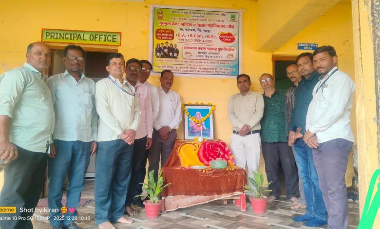 नांदा येथील गुरुकुल कला, वाणिज्य व विज्ञान महाविद्यालयात दिनांक 20 डिसेंबर 2025 रोजी संत गाडगेबाबा यांच्या पुण्यतिथीचा कार्यक्रम राष्ट्रीय सेवा योजना विभागाद्वारे घेण्यात आला.याप्रसंगी या कार्यक्रमाचे अध्यक्ष म्हणून महाविद्यालयाचे प्रभारी प्राचार्य डॉ. राजेश डोंगरे, राष्ट्रीय सेवा योजना विभागाचे कार्यक्रम अधिकारी डॉ. प्रशांत पुराणिक, महाविद्यालयाचे ग्रंथपाल प्रा. सचिन कर्णेवार यांची प्रामुख्याने उपस्थिती होती.