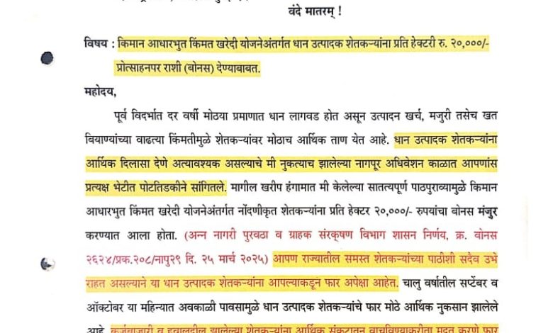 मागील खरीप हंगामात आ. सुधीर मुनगंटीवार यांनी केलेल्या सातत्यपूर्ण पाठपुराव्यामुळे किमान आधारभूत किंमत खरेदी योजनेअंतर्गत नोंदणीकृत शेतकऱ्यांना प्रति हेक्टरी २० हजार रुपयांचा बोनस देण्याबाबत शासन निर्णय घेण्यात आला होता. त्याच धर्तीवर यंदाही शेतकऱ्यांना दिलासा देण्याची गरज असल्याचे त्यांनी मुख्यमंत्र्यांच्या निदर्शनास आणून दिले.