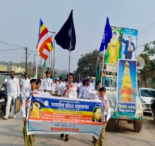 जिवती :- भीमा कोरेगाव शौर्य दिनानिमित्त जिवती येथे भारतीय बौद्ध महासभा, जिवती तालुका व शहर शाखेच्या वतीने १ जानेवारी २०२६ रोजी शांततामय व संविधानिक पद्धतीने समता सैनिक दलाचे शहरात शिस्तबद्ध पथसंचलनासह शांततामय वातावरणात भव्य कार्यक्रम साजरा करण्यात आला.