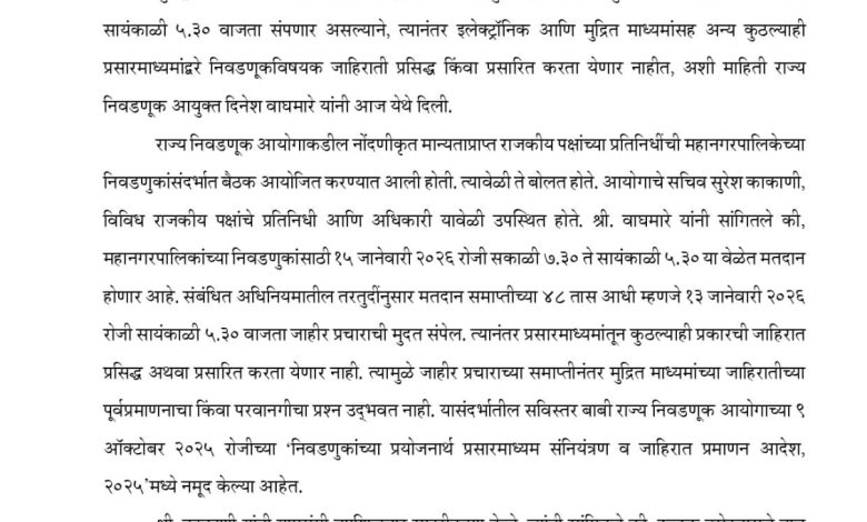 महानगरपालिका सार्वत्रिक निवडणूक २०२५-२६ च्या अनुषंगाने मतदान १५ जानेवारी २०२६ रोजी होणार असून, मतदानाच्या ४८ तास आधी म्हणजे १३ जानेवारी २०२६ रोजी सायंकाळी ५.३० वाजता निवडणूक प्रचार-प्रसाराचा कालावधी संपणार आहे. हा कालावधी संपल्यानंतर कोणत्याही प्रकारची निवडणूकविषयक जाहिरात प्रसिद्ध अथवा प्रसारित करता येणार नसल्याचे स्पष्ट निर्देश राज्य निवडणूक आयोगाने दिले आहेत.
