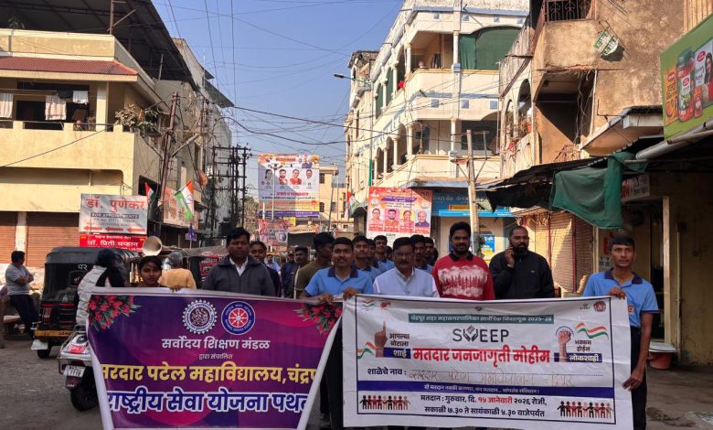 चंद्रपूर :_ येथील सरदार पटेल महाविद्यालयातील राष्ट्रीय छात्र सेना व राष्ट्रीय सेवा योजना यांच्या संयुक्त विद्यमाने चंद्रपूर शहर महानगरपालिका सार्वत्रिक निवडणुकीच्या पार्श्वभूमीवर मतदान जनजागृती अभियान राबविण्यात आले. महाविद्यालयाचे प्राचार्य डॉ. पी. एम. काटकर यांच्या मार्गदर्शनाखाली पार पडलेल्या या कार्यक्रमात मतदान जनजागृती रॅली चंद्रपूर शहरातून काढण्यात आली.