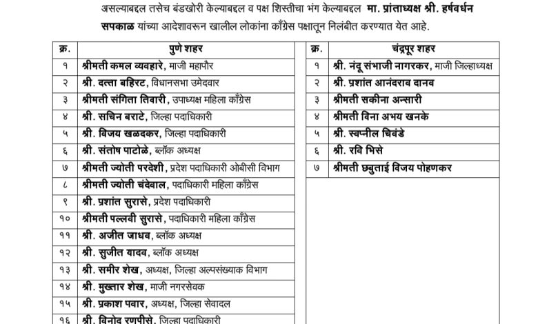 या कारवाईमध्ये चंद्रपूर शहर काँग्रेसमधील महत्त्वाच्या नेत्यांचा समावेश असून, प्रामुख्याने माजी जिल्हाध्यक्ष नंदू संभाजी नागरकर यांना पक्षातून निलंबित करण्यात आले आहे. त्यांच्यासोबतच माजी नगरसेवक प्रशांत आनंदराव दानव, माजी नगरसेवक सकीना अन्सारी, माजी नगरसेवक विना अभय खनके, स्वप्नील चिवंडे, रवि भिसे आणि छबुताई विजय पोहणकर या सात जणांवर निलंबनाची कारवाई करण्यात आली आहे.