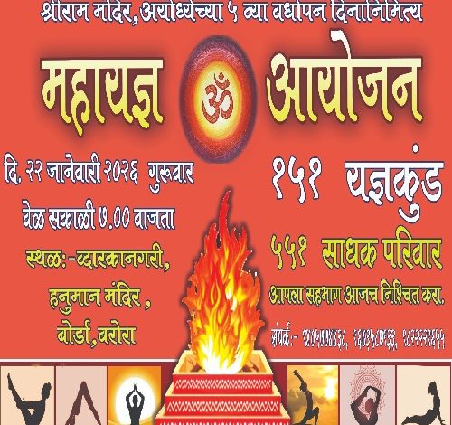 वरोरा : श्रीराम मंदिर, अयोध्येच्या पाचव्या वर्धापन दिनानिमित्त द्वारकानगरी, बोर्डा येथे भव्य महायज्ञाचे आयोजन करण्यात आले आहे. महायज्ञ आयोजन समिती, हनुमान मंदिर द्वारकानगरी बोर्डा, पतंजली योग समिती वरोरा तसेच विविध सेवाभावी संस्था व मंडळांच्या संयुक्त विद्यमाने २२ जानेवारी रोजी सकाळी ७.०० ते ९.०० वाजेपर्यंत हा सामुहिक महायज्ञ सोहळा संपन्न होणार आहे.