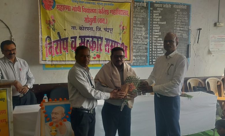 महात्मा गांधी विद्यालय, सोनुर्ली येथे वर्ग 10 च्या विद्यार्थ्यांना वर्ग 9 च्या बिद्यार्थ्यांकडून निरोप देण्यात आला. याप्रसंगी प्रमुख पाहुणे म्हणून श्री साईनाथ मेश्राम मुख्याध्यापक, म गा विद्यालय गडचांदूर व सतीश ठाकरे सर हे होते. या प्रसंगी अध्यक्ष स्थानी प्राचार्य, मुख्याध्यापक श्री बबन भोयर होते यावेळी इतर सर्व शिक्षक व शिक्षेकेत्तर कर्मचारी उपस्थित होते. या प्रसंगी प्रमुख पाहुण्यांचा शाल श्रीफळ देऊन सत्कार कारण्यात आला. या प्रसंगी प्राचार्य मेश्राम यांनी विध्यार्थांनी मेहनत घेऊन अधिकाधिक गुण मिळावावे मग वाटल्यास आपल्या आवडीनुसार समोरील शाखा निवडावी व त्यात यश प्राप्त करावे, त्याचा वापर स्वतः बरोबर समाजासाठी करून ध्यावा असे मार्गदर्शनपर भाषणात व्यक्त केले.