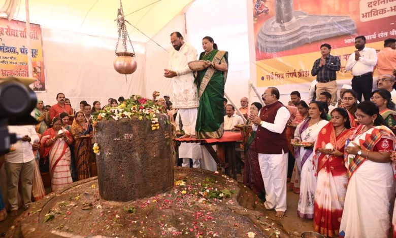 चंद्रपूर : महाशिवरात्री महोत्सवानिमित्त लालपेठ, भिवापूर वार्ड, येथील सुमारे ३०० वर्षे पुरातन व महाराष्ट्रातील सर्वात विशाल महाशिवलिंग स्थळी आज सकाळी १०८ दांपत्यांच्या हस्ते महाआरती करण्यात आली. यावेळी आमदार किशोरभाऊ जोरगेवार सहपत्नीक उपस्थित होते. वेदमंत्रांच्या गजरात आणि ‘हर हर महादेव’च्या घोषणांनी परिसर दुमदुमून गेला होता.