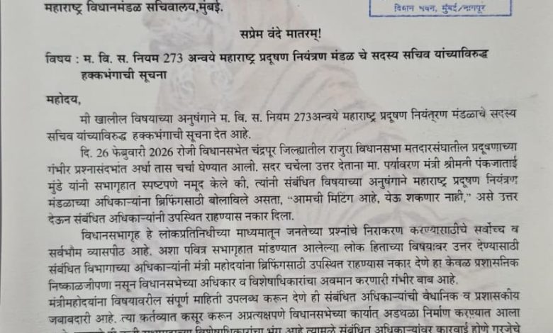 विधानसभागृह हे लोकप्रतिनिधींच्या माध्यमातून जनतेच्या प्रश्नांचे निराकरण करण्यासाठीचे सर्वोच्च व सर्वभौम व्यासपीठ आहे. अशा पवित्र सभागृहात मांडण्यात आलेल्या लोक हिताच्या विषयावर उत्तर देण्यासाठी संबंधित विभागाच्या अधिकाऱ्यांनी मंत्री महोदयांना ब्रिफिंगसाठी उपस्थित राहण्यास नकार देणे हा केवळ प्रशासनिक निष्काळजीपणा नसून विधानसभेच्या अधिकार व विशेषाधिकारांचा अवमान करणारी गंभीर बाब आहे.मंत्रीमहोदयांना विषयावरील संपूर्ण माहिती उपलब्ध करून देणे ही संबंधित अधिकाऱ्यांची वैधानिक व प्रशासकीय जबाबदारी आहे. त्या कर्तव्यात कसूर करून अप्रत्यक्षपणे विधानसभेच्या कार्यात अडथळा निर्माण करण्यात आला आहे. त्यामुळे ही कृती सभागृहाच्या विशेषाधिकारांचा भंग आहे.त्यामुळे संबंधित अधिकाऱ्यांवर कारवाई होणे गरजेचे आहे. महाराष्ट्र प्रदूषण नियंत्रण मंडळ चे सदस्य सचिव यांच्या विरुद्ध हक्कभंगाचा प्रस्ताव स्वीकारून हा विषय विशेषाधिकार समितीकडे पुढील चौकशी व कारवाईसाठी पाठवावा अशी मागणी आ. मुनगंटीवार यांनी केली.