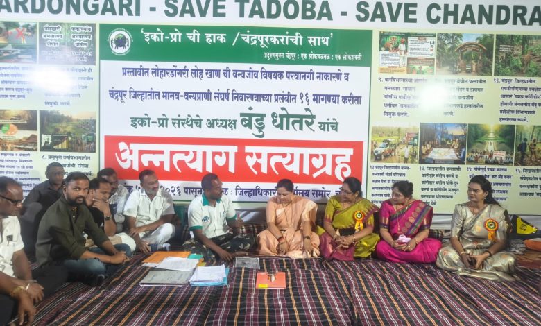 चंद्रपूर :- प्रस्तावित ‘लोहारडोंगरी’ लोह खनिज उत्खनन प्रकल्पामुळे ताडोबा-अंधारी व्याघ्र प्रकल्पाच्या कॉरिडॉरला निर्माण झालेला धोका आणि जिल्ह्यातील भीषण मानवी-वन्यजीव संघर्ष या प्रश्नांकडे लक्ष वेधण्यासाठी इको-प्रो संस्थेचे अध्यक्ष तथा पर्यावरणप्रेमी बंडू धोतरे यांनी जिल्हाधिकारी कार्यालयासमोर ‘अन्नत्याग सत्याग्रह’ सुरू केला आहे. या आंदोलनाला खासदार प्रतिभा धानोरकर यांनी भेट देऊन पाठिंबा दर्शविला. यावेळी त्यांनी आंदोलनकर्त्यांशी सविस्तर चर्चा करून त्यांच्या प्रलंबित १६ मागण्या जाणून घेतल्या.