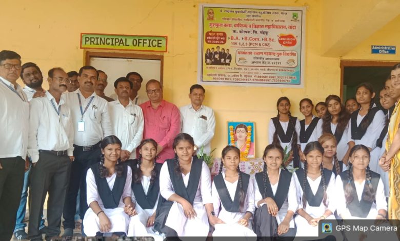 गुरुकुल कला, वाणिज्य व विज्ञान महाविद्यालय, नांदा येथे राष्ट्रीय सेवा योजना विभागामार्फत दिनांक 10 मार्च 2026 रोजी क्रांतीज्योती सावित्रीबाई फुले यांच्या पुण्यतिथीचा कार्यक्रम घेण्यात आला. याप्रसंगी वंदनीय राष्ट्रसंत तुकडोजी महाराज बहुउद्देशीय मंडळाचे सचिव डॉ. अनिल मुसळे, महाविद्यालयाच्या राष्ट्रीय सेवा योजना विभागाचे कार्यक्रम अधिकारी डॉ. प्रशांत पुराणिक, ग्रंथपाल प्रा. सचिन कर्णेवार, महाविद्यालयाचे शिक्षकेतर कर्मचारी, श्री प्रभू रामचंद्र विद्यालयाचे शिक्षक रुपेश विरुटकर, नदीम शेख, हेमंत बारसागडे, प्रवीण कुळसंगे, अरविंद कुचनकर यांची प्रामुख्याने उपस्थिती होती.