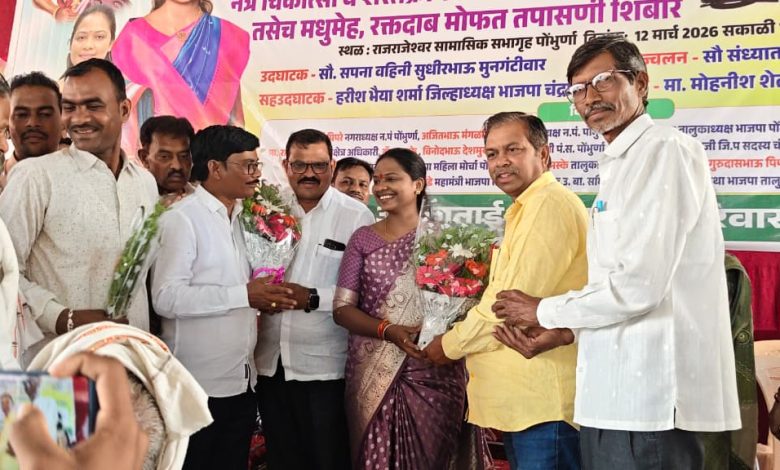 पोंभुर्णा : आदरणीय सुधीर भाऊ मुंगनटीवार यांच्या कार्यकर्ते असलेल्या अल्का आत्राम यांनी आपल्या गुरुचा वसा जोपासात सामाजिक बांधिलकीने त्यांचा वाढदिवस साजरा करण्याचा माणसं अल्का ताई मित्र परिवाराने व्यक्त करीत आज क्रांतिवीर बाबुराव शेडमाके यांच्या जयंतीचे औचित्य साधून तसेच भारतीय जनता पक्ष महिला मोर्चाच्या प्रदेश महामंत्री कुमारी अलका आत्राम यांच्या वाढदिवसानिमित्त नेत्र चिकित्सा तपासणी व शस्त्रक्रिया तसेच मोफत चष्मे वाटप रक्तदाब मधुमेह तपासणी शिबिराचे आयोजन करण्यात आले.