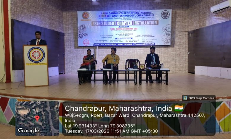 सरदार पटेल मेमोरियल सोसायटी द्वारा संचलित राजीव गांधी कॉलेज ऑफ इंजिनियरिंग रिसर्च अँड टेक्नॉलॉजी (RCERT), चंद्रपूर येथे इंडियन सोसायटी फॉर टेक्निकल एज्युकेशन (ISTE) विद्यार्थी अध्याय स्थापना व कार्यक्रम उद्घाटन सोहळा उत्साहात पार पडला. विद्यार्थ्यांमध्ये तांत्रिक प्राविण्य, नेतृत्वगुण व व्यावसायिक कौशल्यांचा विकास घडवून आणण्याच्या उद्देशाने हा कार्यक्रम महाविद्यालयाच्या सभागृहात आयोजित करण्यात आला होता.