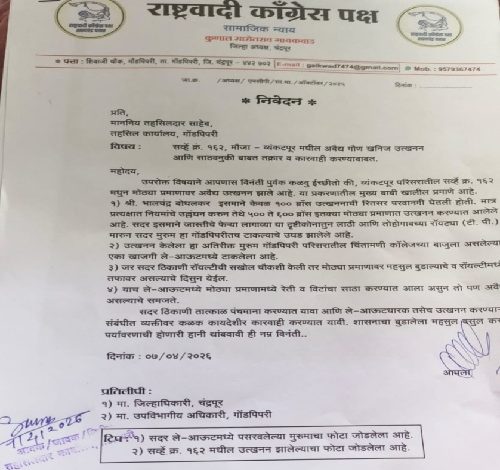 गोंडपिपरी तालुक्यातील व्यंकटपूर येथील सर्वे क्र. १६२ मध्ये मोठ्या प्रमाणावर अवैध गौण खनिज उत्खनन आणि साठवणूक होत असल्याचा खळबळजनक प्रकार समोर आला आहे. याप्रकरणी राष्ट्रवादी काँग्रेस पक्षाच्या (सामाजिक न्याय विभाग) वतीने गोंडपिपरीचे तहसीलदार शुभम बहाकर यांना पुराव्यानिशी निवेदन सादर करण्यात आले असून, दोषींवर तातडीने कठोर कारवाई करण्याची मागणी करण्यात आली आहे.