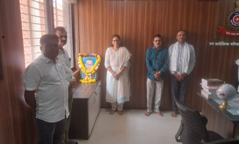 डॉ. बाबासाहेब आंबेडकर यांच्या फोटोला स्नेहा मेंढे उपप्रादेशिक परिवहन अधिकारी यांनी मालाअर्पण करून अभिवादन केले