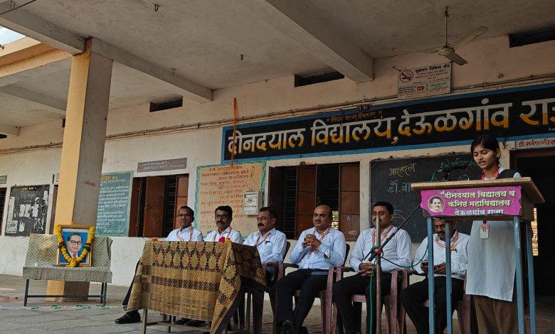 दे.राजा :- शिक्षण प्रसारक मंडळ चिखली द्वारा संचालित दीनदयाल विद्यालय व कनिष्ठ कला आणि विज्ञान महाविद्यालय दे.राजा येथे महामानव डॉ. बाबासाहेब आंबेडकर यांची जयंती उत्साहात साजरी करण्यात आली.